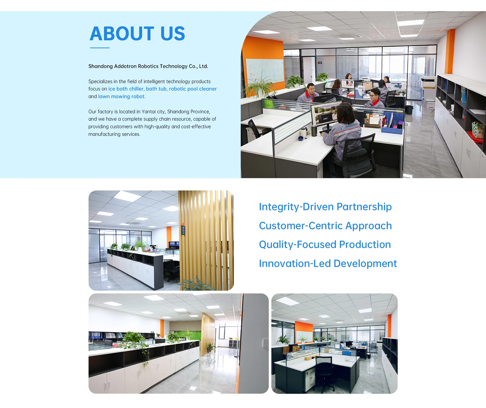 Productos principales:Enfriador de baño de hielo, bañera de hielo, limpiador robótico de piscinas, cortacésped robótico
